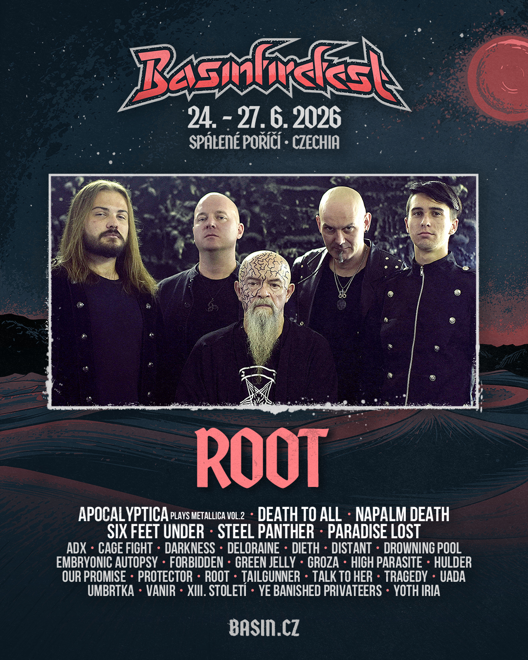 Málokterá tuzemská formace zanechala v celosvětovém metalovém undergroundu tak hlubokou stopu jako brněnští Root. Od svého vzniku v roce 1987 prošli fascinující transformací – od syrového, nekompromisního black metalu na kultovním debutu Zjevení až po epický, temně atmosférický zvuk alb jako The Temple in the Underworld nebo koncepční ságy Kärgeräs. V čele této legendy stojí nepřehlédnutelný Big Boss, jehož charismatický baryton a divadelní projev dodávají hudbě až rituální rozměr. Root nejsou jen o agresi; jejich síla tkví v rafinovaných aranžích, heavy metalové melodice a schopnosti budovat napětí bez zbytečného chaosu. Skladby jako „Píseň pro Satana“ nebo „Leviathan“ jsou dnes již žánrovými hymnami, které rezonují u fanoušků napříč generacemi. Na Basinfirefestu se připravte na lekci z temné historie, která i po dekádách na scéně neztratila nic ze své uhrančivosti a autentičnosti.